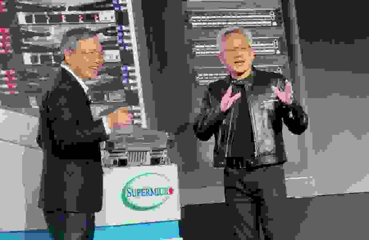 輝達執行長黃仁勳(右)為美超微的DCBBS方案站台,美超微總裁兼執行長梁見後笑開懷。小豪葛格/攝影